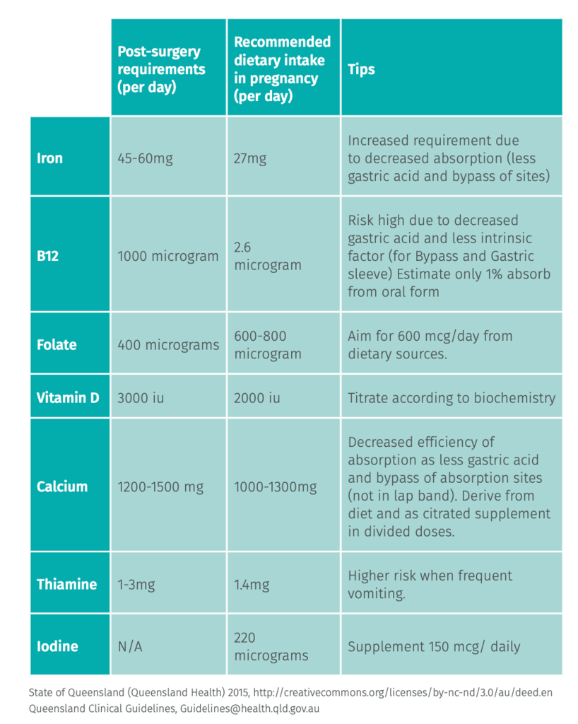 | Special mention for pregnant ladies after bariatric surgery Higher doses of folic acid may be needed such as 4-5g a day Iron and vitamin B12 replacement is almost routinely given Calcium and vitamin D supplements >50nmol/L is recommended Caution with vitamin A (retinol) supplement because it may be potentially teratogenic Fetal growth monitoring with ultrasound at 28, 32 and 36 weeks is a minimum Blood tests such as HbA1C is performed instead of OGTT Please note: Regular over the counter vitamin supplements are not likely to be sufficient *Specialised post op bariatric multivitamin supplements are sometimes recommended especially for deficiencies in iron, folate, B12 and vitamin D *Note that high levels of folic acid may also mask vitamin B12 deficiency, which is also important in the foetal neurological development* *Vomiting during pregnancy is associated with thiamine (B1) deficiency *Foods high in vitamin A or retinol based (A) supplements should be avoided in pregnant women to avoid vitamin A toxicity but at the same time vitamin A deficiency should be avoided (Beta carotene is recommended) |
