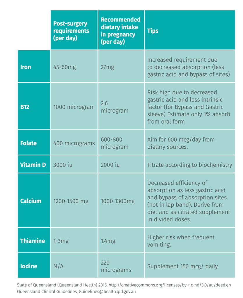 | Special mention for pregnant ladies after bariatric surgery Higher doses of folic acid may be needed such as 4-5g a day Iron and vitamin B12 replacement is almost routinely given Calcium and vitamin D supplements >50nmol/L is recommended Caution with vitamin A supplement because it is potentially teratogenic Fetal growth monitoring with ultrasound at 28, 32 and 36 weeks is a minimum Blood tests such as HbA1C is performed instead of OGTT Please note: Regular over the counter vitamin supplements are not likely to be sufficient *Specialised post op bariatric multivitamin supplements are sometimes recommended especially for deficiencies in iron, folate, B12 and vitamin D *Note that high levels of folic acid may also mask vitamin B12 deficiency, which is also important in the foetal neurological development *Vomiting during pregnancy is associated with thiamine (B1) deficiency *Foods high in vitamin A or retinol based (A) supplements should be avoided in pregnant women to avoid vitamin A toxicity but at the same time vitamin A deficiency should be avoided (Beta carotene is recommended) |