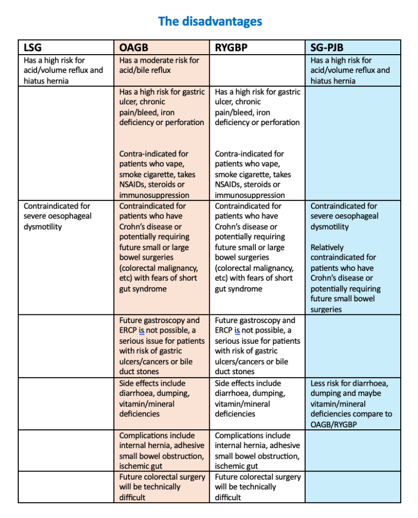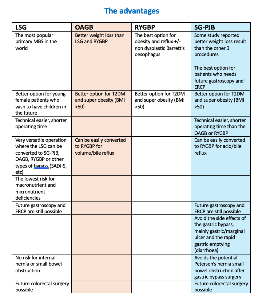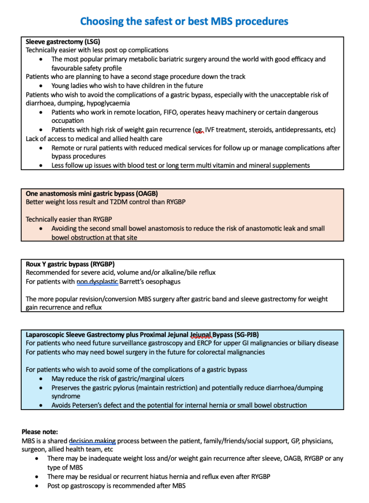 | Options for Laparoscopic Metabolic Bariatric Surgery (MBS) 2026 Patient choices There are 3 common types of primary procedures available: Laparoscopic Sleeve Gastrectomy (LSG) Laparoscopic One Anastomosis Gastric Bypass (Mini bypass) (OAGB) Laparoscopic Roux Y Gastric Bypass (RYGBP) These can be primary or revision/conversion procedures available: Laparoscopic One Anastomosis Gastric Bypass (Mini bypass) (OAGB) Laparoscopic Roux Y Gastric Bypass (RYGBP) Laparoscopic Sleeve Gastrectomy plus Proximal Jejunal Bypass (SG-PJB) Laparoscopic Re-Sleeve Gastrectomy (rLSG) Newer surgery Laparoscopic Sleeve Gastrectomy plus Proximal Jejunal Jejunal Bypass (SG-PJB) *Potentially better weight loss result *Potentially less side effects and complications than a gastric bypass *Easier and a possible alternative to SADI-S and duodenal switch procedures |